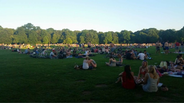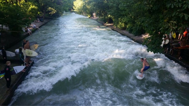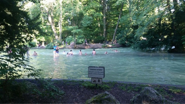 The English garden is like Munich’s Central Park.There were literally thousands of people enjoying the cool grass and rivers. Huge groups of people were drinking beer, having picnics and laying in the sun. We stopped to watch the surfers on Munich’s two waves, and then laughed as huge groups of people jumped in the river (right next to the many “no swimming/surfing – you might die” signs. They would float down for a while climb out and then hike back up to do it again. It looked refreshing but we weren’t dressed for it and we also felt like we should have an experienced local with us.