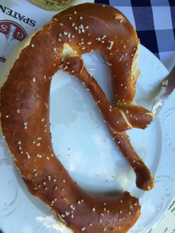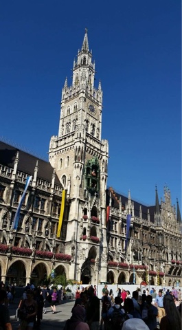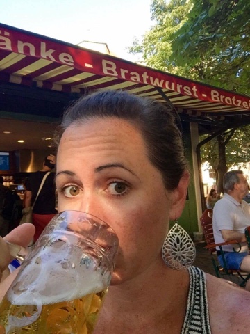 After a relaxing train ride into the city center we headed out on foot to explore. I have been to Munich many times so I took the other two to my favorite places. We walked through Marienplatz to the Viktualienmarkt. Our timing was perfect and we got to see the Knights jousting in the historic glockenspiel. We found some space at a table with a German/Scottish couple and shared pretzels, obatza, sausages and drinks. It was the perfect first stop.