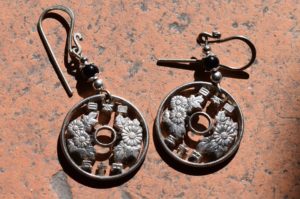 The destination we were ultimately headed for was a small artisan market that was listed in the local paper. One of the artists was making jewelry out of coins from around the world. The plain parts of the coins had been cut away and only the intricate flowers, silhouettes, or words were left behind. I took one look and asked him if he had done the work with a laser cutter. He just grinned and showed me his handsaw. He was working on the outline of a caribou on a Canadian coin. I purchased a lovely pair from him that were made from 50 Yen coins.