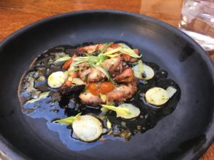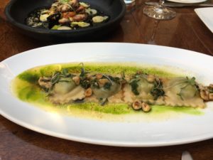 Starters: Pea and Mint Ravioli with Parmesan and Hazelnuts, Octopus with Tomatoes, Potatoes, and Celery.