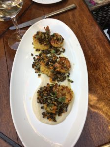 Mains: Curried Shrimp and Scallops with black lentils and cauliflower puree, Chicken with polenta, tomatoes, zucchini, and olives.