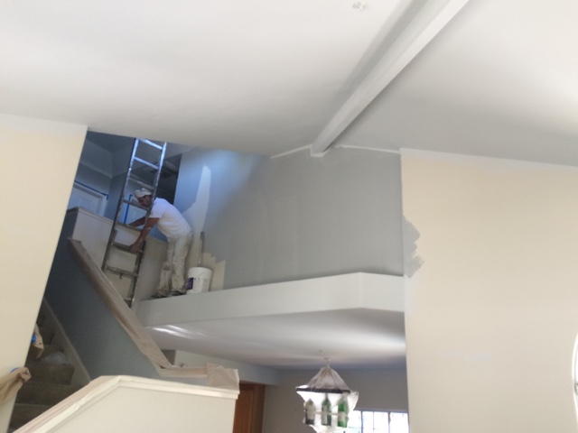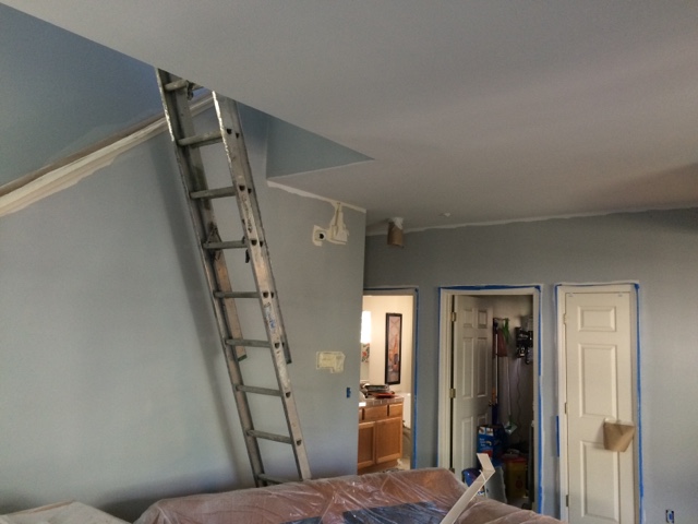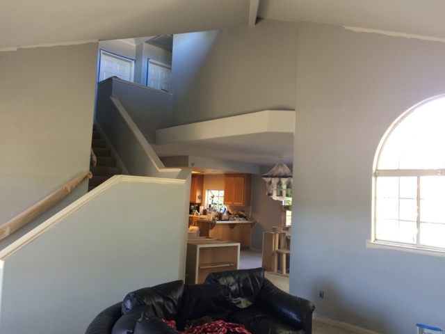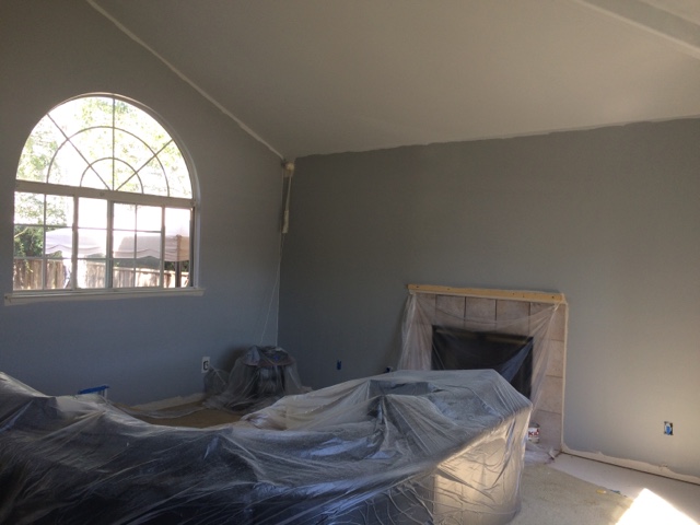 I can’t believe the progress our painter made in one day! Walls are “lunar surface” which we have found looks anywhere from blue to dark gray depending on the light. Ceiling is “evening white”. Same gray just two shades lighter.