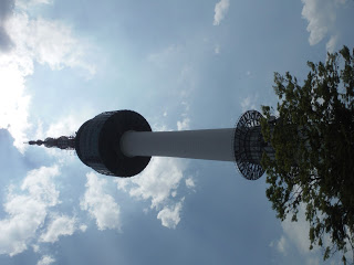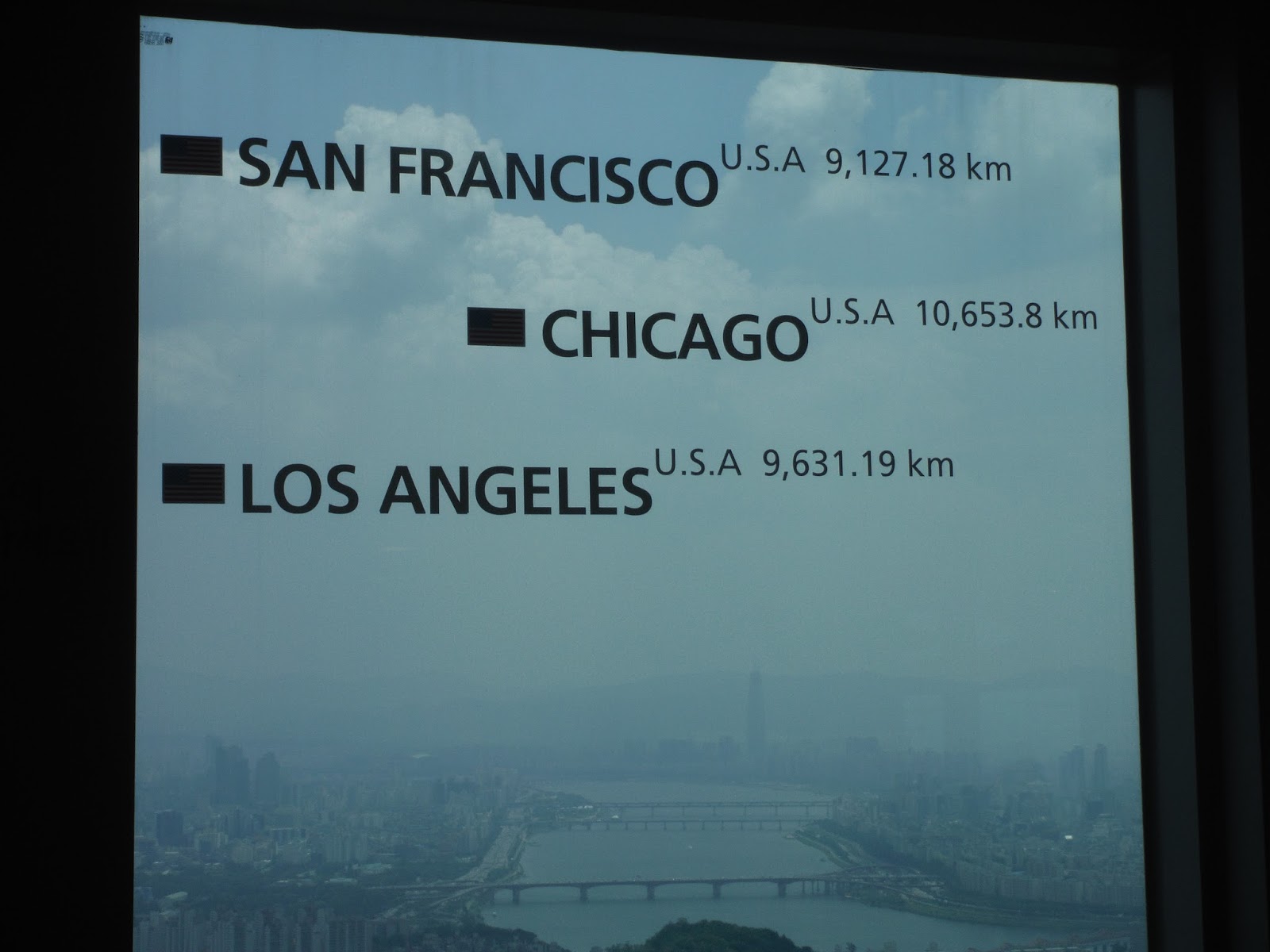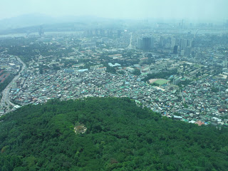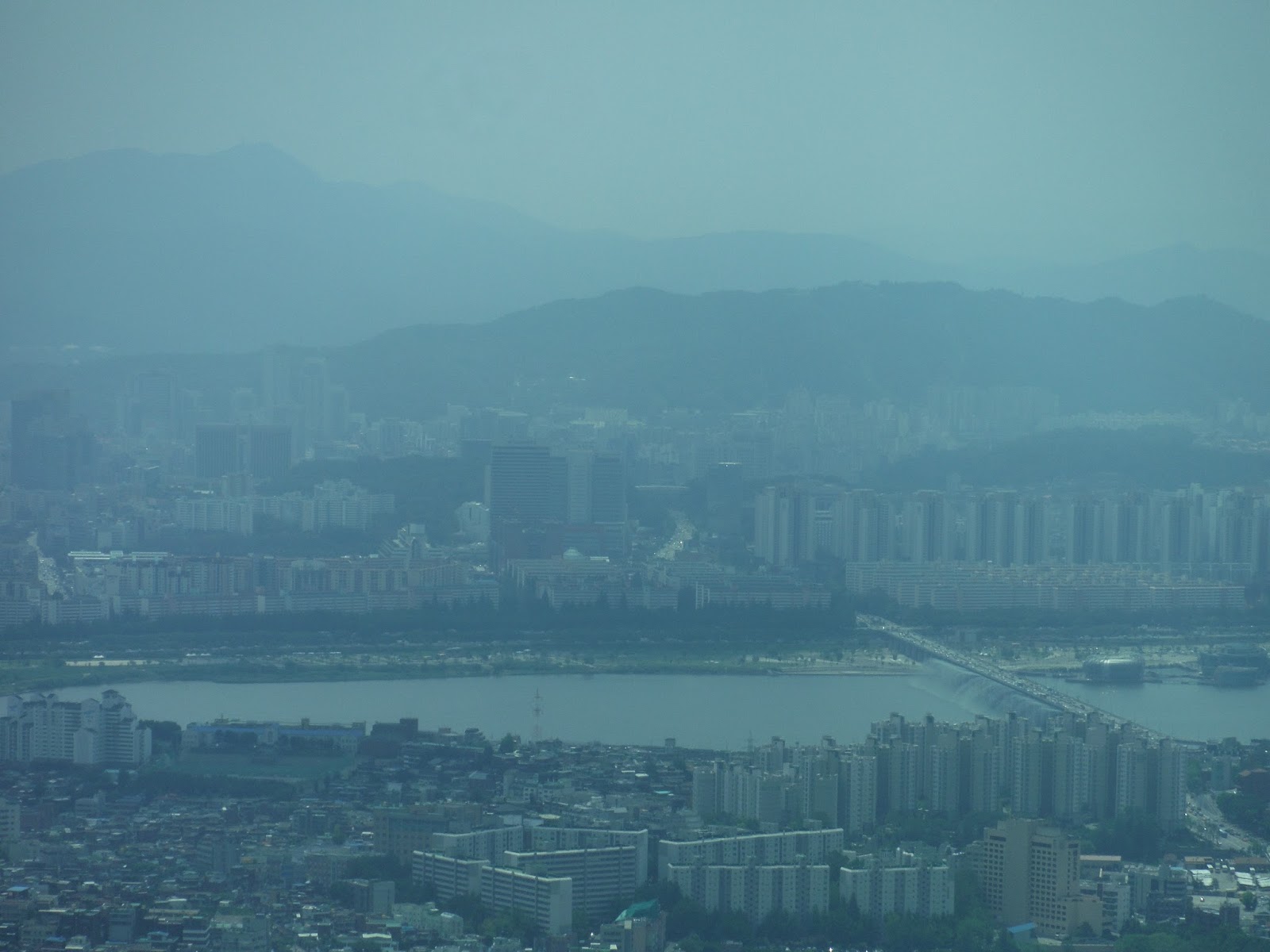 I boarded the “Cable Car” – more of a gondola than what we think of cable cars – and rode the five minutes up the hill to the Seoul Tower. I took a nice long break and read my book in the shade with a view of downtown Seoul. Then I headed up to the top of the Seoul Tower. I typically skip activities like this but it was pretty cheap and I figured this would probably be my only chance to see all of Seoul in one place. The ride up the tower was quick and the views were spectacular. It was pretty hazy today so the views aren’t very clear. I could feel the tower swaying in the wind slightly so I didn’t stay long. I returned to the base of the mountain on the gondola – and took the escalator down to street level this time.