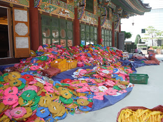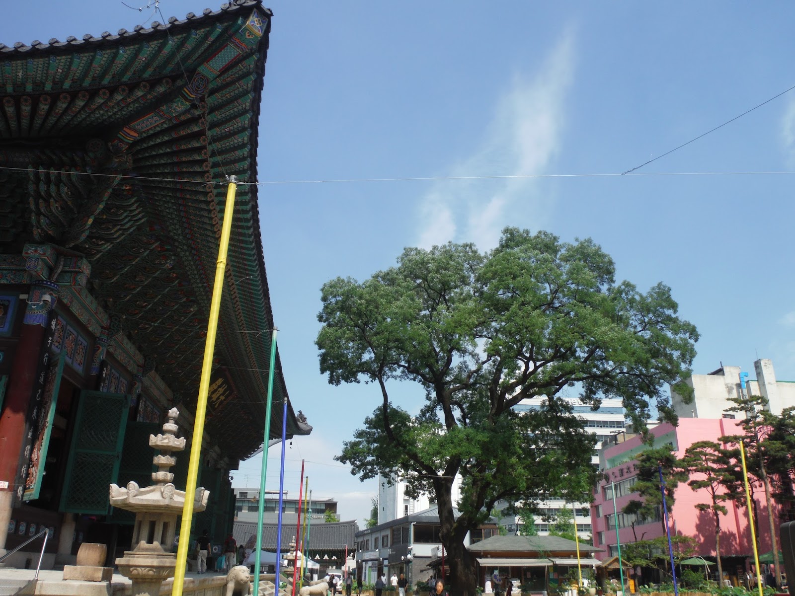 After Meyengdong I grabbed a Taxi and had the driver take me to the Jogyesa Temple. Taxis are actually pretty reasonable in Seoul and there were no subway lines going directly where I needed to go. Sometimes five minutes in a taxi trumps an hour of subway changes. The temple is one of Korea’s most famous Buddhist temples. Prayers were happening when I got there so I couldn’t take any photos of the three giant golden Buddhas. I did get some photos outside – the crew was setting up for the annual lantern festival so there were piles of lanterns everywhere. We will be gone before the festival or I would definitely come back to see it.