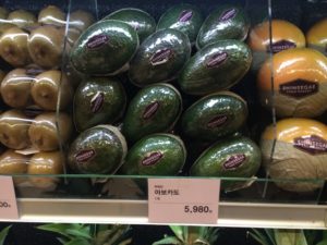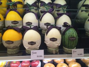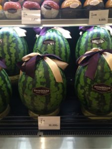 Our hotel is lovely and located above a fancy shopping mall. We spent some time wandering the labyrinth of clothing and electronics stalls and then found the food hall. The food hall was similar to those we have seen in European department stores. Everything beautifully packaged. Imported food is crazy expensive. Not a pear to be seen so far…but the $30 watermelon had a pretty bow!