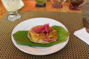About a ten-minute walk through beautiful streets led us to our second stop “La Casa Del Diezmo” where we sampled pit-roasted pork marinated in achiote served on a black bean filled tortilla. They also served some limeade (which turned out to be Kool-Aid) with chia seeds floating in it. It was very refreshing and served in a beautiful cool garden.
