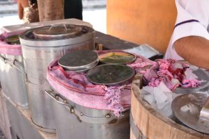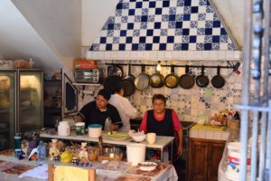 Stop number three was at “La Cocina Cafe Del Viajero” where we had a chicken filled corn tortilla with Oaxacan Mole Negro. I have had Mole a few times because it is one of Charlie’s favorites. This was the most bitter Mole I have tasted. The first bite was a bit of a shock, but it really grew on me. The best part of this place was standing on the street looking into the kitchen.