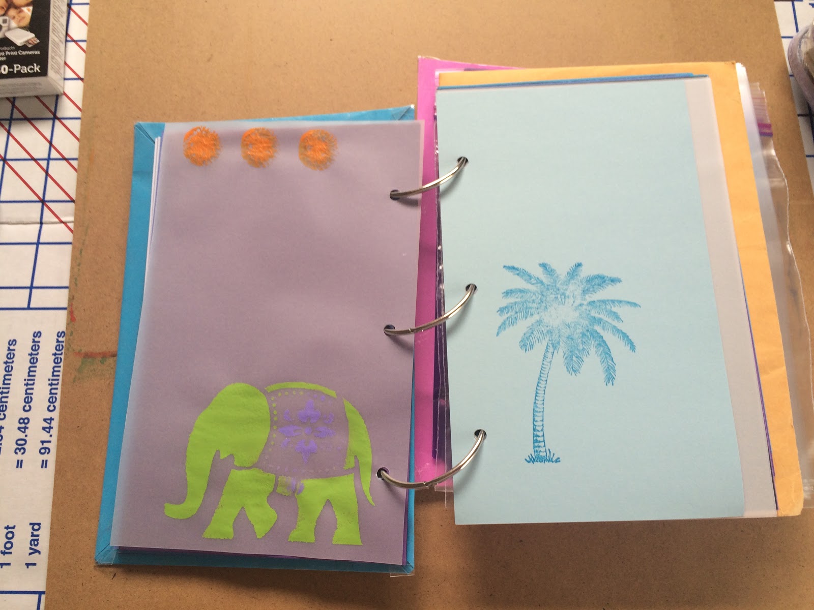 Then I cut a big stack of pages to use inside the book and randomly stamped, decorated, and trimmed them for interest.  I will pick one or more each day that fits my mood to decorate- the rings will allow me to put them in any order I choose.  I also included a manilla envelope, ziploc, and some 5×8 binder paper I found at staples a few years ago.