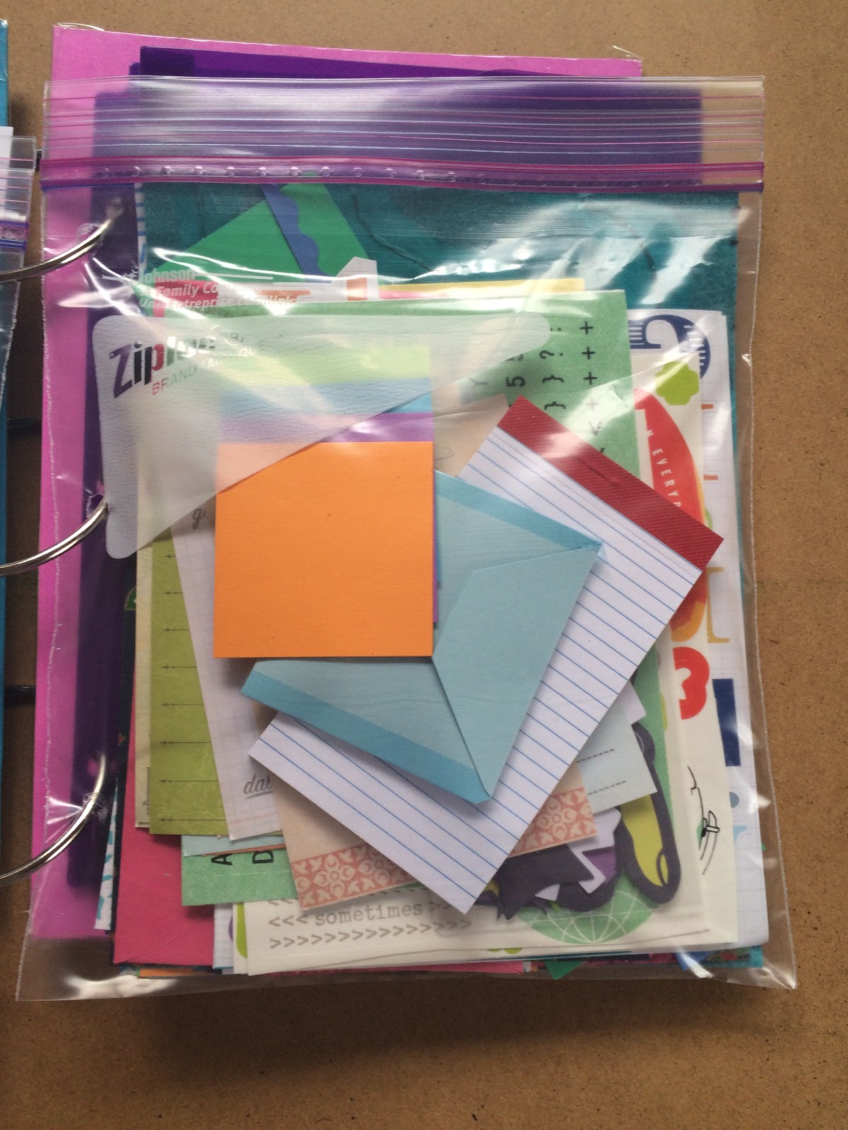 In the back of my “binder” I added a ziploc bag to hold post-its, stickers, and assorted fun papers to embellish with as I create.  I really wanted to go crazy shopping for embellishments and stickers but I kept reminding myself that it will be more fun to find those things where I am going.