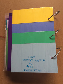 I really like to write down what we do/see/eat when we go places, but an entire book of empty pages seems to overwhelm me every time.   I also don’t like the idea of keeping a running log that I simply add to each trip – thus the stack of partially used journals.  I am not interested in long winded philosophical entries, or drawing in a sketch book.   Luckily I found what I think will be a perfect solution on Pinterest.